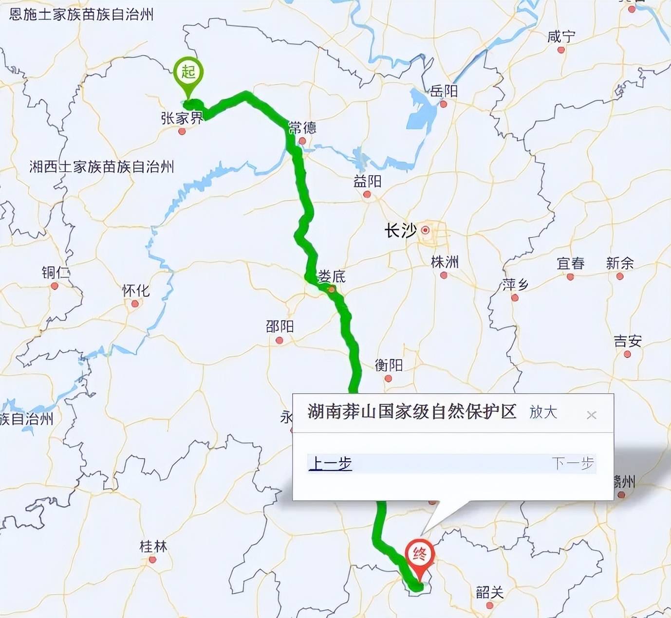 张家界和莽山相距700公里,一个位于湖南北部,一个位于湖南南部。图片来源:百度地图