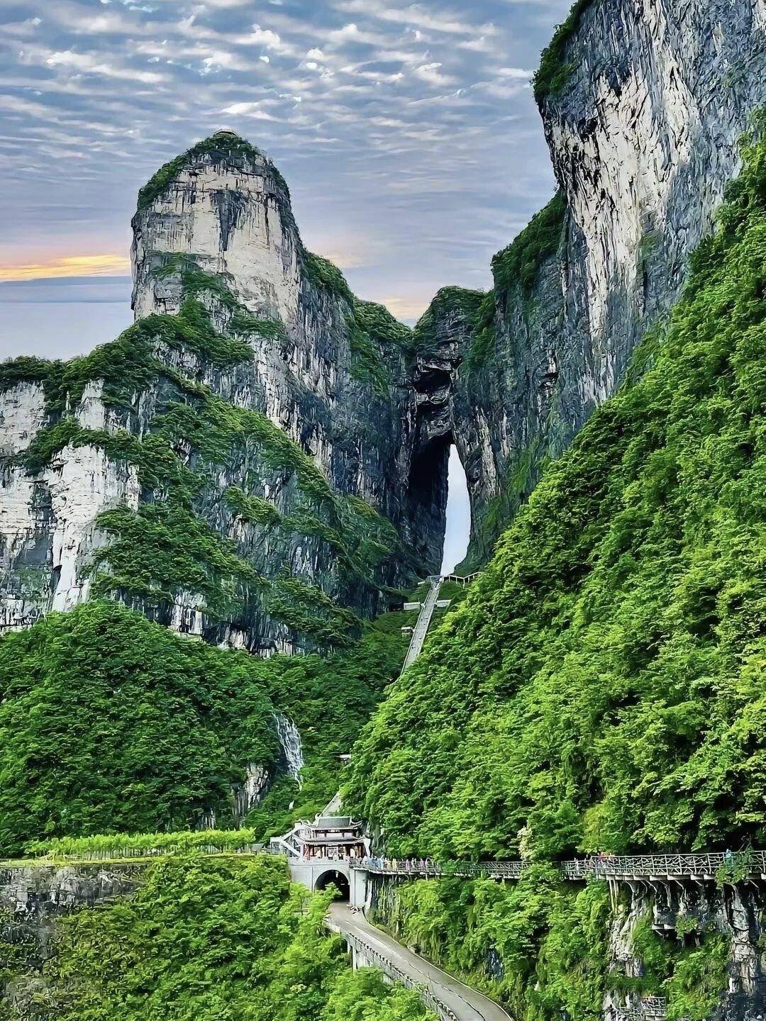 第3天:金鞭溪→天门山。早上起得不算早,慢悠悠地出发去金鞭溪,这里真的是天然氧吧,溪水清澈见底,能看到水底的小石子,两岸的绿树成荫,遮住了大太阳,走在溪边格外凉爽,微风一吹,全是草木的清香,特别舒服。偶尔能看到野生猕猴,小安反复提醒我们“千万别投喂、别伸手去逗它们,它们性子野,容易抓伤”,我们都记在了心里,远远地看着就好。我们走了1.5小时的精华路段,打卡了神鹰护鞭、千里相会等经典景点,溪水潺潺,听着鸟叫,十分惬意。中午吃完午饭,就出发去天门山,小安提前帮我们抢好了A线门票,省去抢票烦恼。坐亚洲最长的高山索道,7455米全程惊险绝美,越往上云雾越浓,又惊险又刺激,但风景真的太美了,再惊险也值得。玻璃栈道需要5元的鞋套费,胆小的朋友可以盯着远处走,其实没那么可怕,站在上面能俯瞰整个山间美景,特别有成就感。之后还打卡了天门洞、999级天梯,虽然没敢爬完天梯,但远远看着就很壮观,傍晚下山后,好好休息了一下,缓解了一天的疲惫。